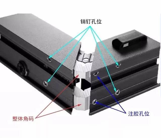 銷釘注膠工藝所用的角碼,是由甲柄材質(zhì)的角碼膠片與4.0-5.0mm厚度一體式的純鋁角碼結(jié)合的特制角碼,這種角碼擁有更強(qiáng)的韌性及穩(wěn)定性。組裝時(shí)灌入耐候性超強(qiáng)的優(yōu)質(zhì)進(jìn)口組角膠進(jìn)行密封,加強(qiáng)了整扇門窗的密封性能。